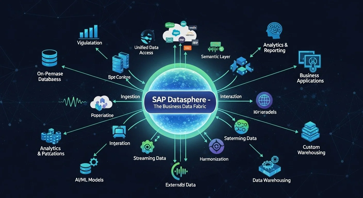 SAP addresses this with the Business Data Fabric, powered by SAP Datasphere. This isn't just a data warehouse; it’s an architecture that ensures all enterprise data, whether residing inside SAP systems (like ERP) or outside (in third-party CRM, supply chain systems, or data lakes), works together harmoniously and in real-time.