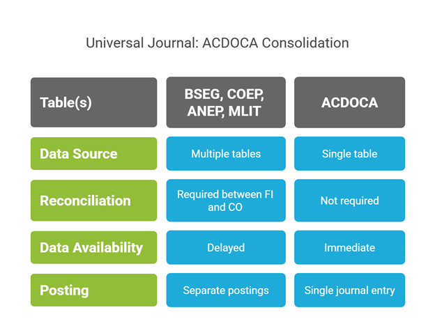 The Universal Journal consolidates the line items from BSEG, COEP, ANEP, MLIT, and others into the ACDOCA table. This provides a single source of truth across legal and management accounting.